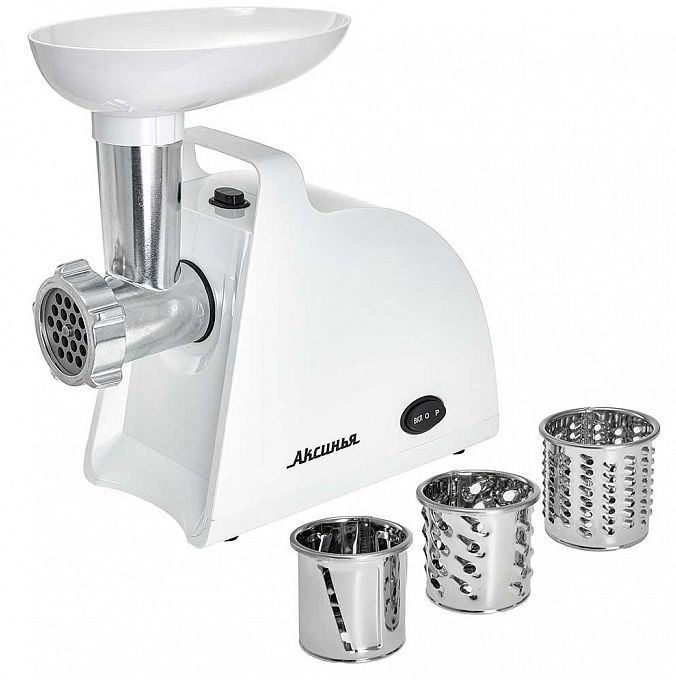 Максимальная мощность 2000 Вт Номинальная потребляемая мощность 300 Вт Производительность 1,8 кг/мин Описание Мясорубка электрическая предназначена для измельчения вареного или сырого мяса и подобных продуктов, а также приготовления печенья в бытовых и аналогичных условиях Подходит для обработки любого вида мяса Цвет: белый Прочный металлический шнек Металлический привод шнека увеличивает надежность и долговечность прибора Крестообразный нож из высококачественной нержавеющей стали Две решетки для измельчения с отверстиями разного диаметра - 5 и 7 мм 3 насадки-овощерезки: мелкая терка крупная терка шинковка Две насадки «КУББЕ» Насадка для набивки колбасок Удобный толкатель Противоскользящие прорезиненные ножки Функция РЕВЕРС обеспечивает простоту очистки шнека при забивании продуктами Система защиты двигателя от перегрева Упаковка: цветная коробка
