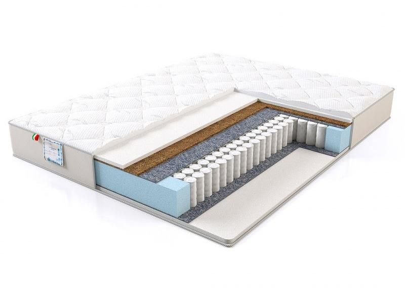 Санрайз – матрас с комбинированной жесткостью, высотой 20 см. На независимом пружинном блоке 500. Периметр матраса усилен массивной вкладкой ППУ. Наполнитель LuxFoam толщиной 2 см и кокос 1 см с одной стороны, LuxFoam 2 см – с другой. Жаккардовый чехол со тежкой из Холкона (плотноть 300 г/м2). Нагрузка 140 кг