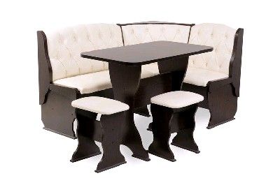 Набор мебели для кухни с классической красивой каретной стяжкой, включающий в себя угловую скамью, стол и два табурета.В угловой скамье под сиденьями расположены два ящика .Каркас ЛДСП.Покрытие верхней части столешницы стола - термостойкий пластик, кромка ПВХ -1мм. Угловая скамья собирается как в правом ("Г"), так и в левом исполнении ("7"). Углы столешницы закруглены для избежания травмирования и придания лучшего эстетического вида.Каракс выолнен из темного ЛДСП - Декор Венге, Обивка мягких частей выполнена из мягкой экокожи - Барнео Крем ( Кремовый цвет ) с каретной классической стяжкой. Размер угловой скамьи по длине 1500х1100 или 1100х1500 в зависимости от сборки ( "Г" или "7"), высота угловой скамьи 840, глубина угловой скамьи 530.Размер стол-цы стола 1000х580, высота стола 750. Размер сденья табуерта 300х380, высота табурета 450.