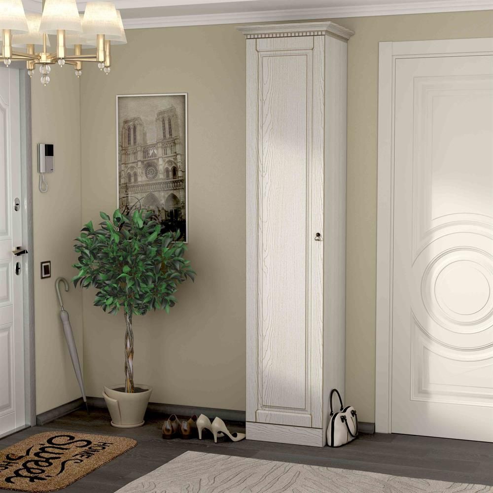 Шкаф однодверный - элемент модульной прихожей ВЕРОНИКА. Изготовлен из лдсп 16мм, фасады мдф покрытые патиной. Ширина указана с учетом багета В комплект входит: Вариант исполнения : Шкаф однодверный-1 шт. Комплект угловых багетов (левый+правый). 1 компл. Модульная прихожая в классическом стиле. Прихожая выполнена в классическом стиле с декоративными элементами. Фасады и декоративные элементы патинированы, патина наносится вручную, по классической итальянской технологии и защищена матовым лаком. Мягкие элементы (вешалка и сиденье) выполнены из экокожи, декорированы каретной стяжкой. Цвет фасада: ясень/патина. Цвет корпуса: бодего светлый. Фасады: МДФ + патинирование + матовый лак. Корпус: ЛДСП.