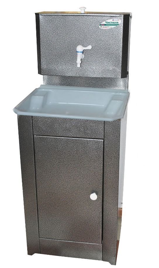 Бак - черный металл, Объем бака - 17 л, раковина - нерж. Сталь, тумба - черный металл Нержавеющая раковина 50 х 40 см. Тумба поставляется в разобранном виде в коробке размером 80 х 54 х 20 см, вес 11,5 кг. Габаритные размеры в собранном виде, мм 1280Х500х460 Умывальник дачный выполнен из высококачественной стали 0,7 мм, окрашен крепкой краской различных цветов: серебро, белый, медь, белое золото, лагуна. Конструкция умывальника Чистюля составная: включает в себя тумбу, которая аккуратно скрывает способ слива воды и позволяет осуществлять водоотвод в канализацию или отдельную емкость и бак с пластиковым краном.