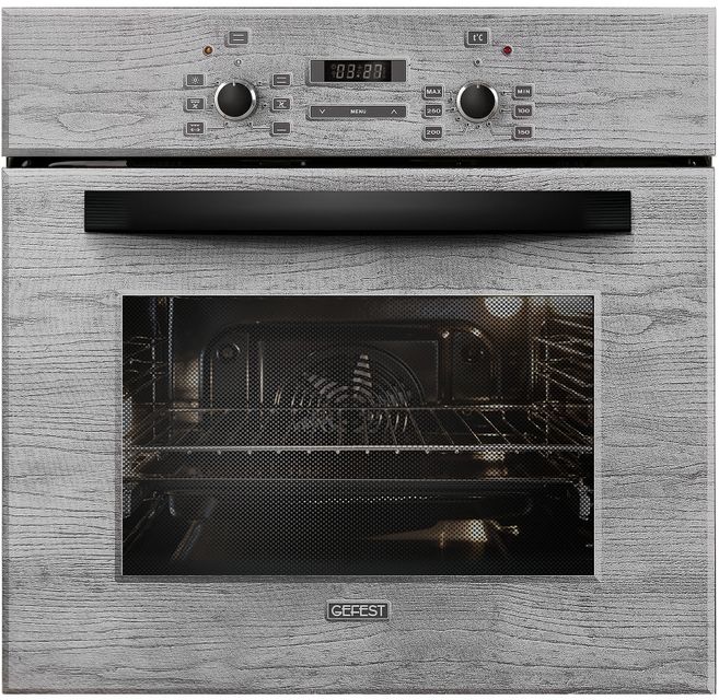 Духовой шкаф. Цвет: серый с рисунком "дерево". Габаритные размеры ШхГхВ: 59.8х56.5х59.5 см. Объём духовки: 55 л. Гриль электрический. Таймер сенсорный. Подсветка духовки двойная. Телескопические направляющие. Съемные проволочные направляющие духовки. Усиленный гриль с конвекцией. Класс электробезопасности: I.