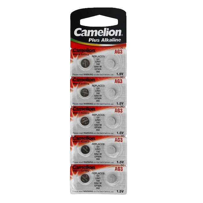 Батарейка алкалиновая Camelion G 3 BL-10 Mercury Free (AG3-BP10(0%Hg), 392A/LR41/192 батарейка для часов), напряжение 1,5В, емкость 28мА*ч, кол-во в упаковке 10 шт., размер упаковки 50x160x5 мм, использовать при температуре от -18 до +55 °C, хранить при температуре от + 15 до + 25 °C. Срок хранения 5 лет.