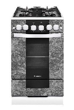Габариты (ШхГхВ) 50х58,5х85 см. 4 газ. горелки. Электророзжиг горелок стола. Гриль горелка. Решетки горелок стола чугунные. Механический таймер. Полезный объём духовки: 52 л. Газ-контроль духовки. Вертел с электроприводом. Направляющие духовки: проволочные. Термоуказатель. Выдвижной ящик для посуды и принадлежностей. Без крышки. Фасад стеклянный с рисунком "мрамор", варочная поверхность: стеклянная.