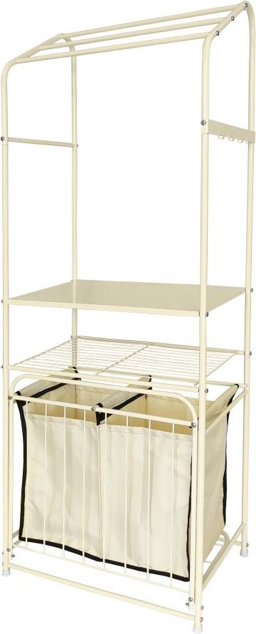 Двойная корзина для белья. Планка с крючками с одной стороны. Перекладины для сушки полотенец. Габариты 600х350х1600 мм. Размер упаковки 610х685х90 мм. Вес 6,6 кг. Высота между полками 190 мм