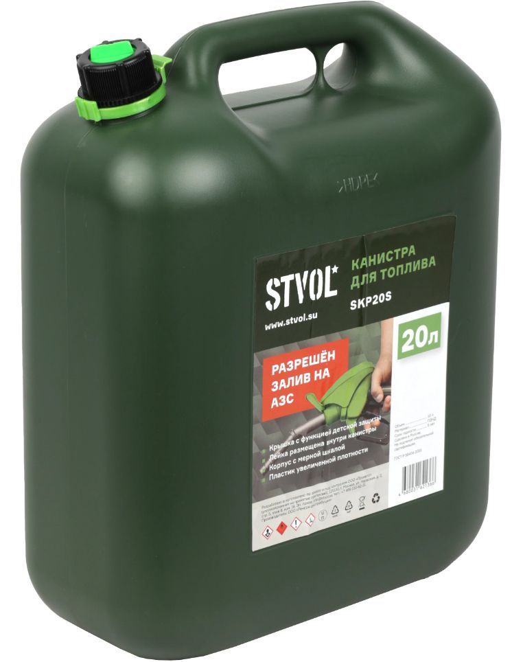 Канистра для бензина 20 л STVOL SKP20s применяется для хранения и транспортировки ГСМ, бензина и других видов топлива. Канистра для бензина выполнена из плотного материала ПЭНД со специальными присадками, предотвращающими накапливание статического разряда. Канистра для ГСМ имеет небольшой вес. За счет надежной резьбовой крышки исключает протекание и испарение топлива, а также оснащена защитой от детей. Для удобства применения, на канистре имеется мерная шкала. Данное изделие сертифицировано в соответствии с Законом РФ о пожарной безопасности.