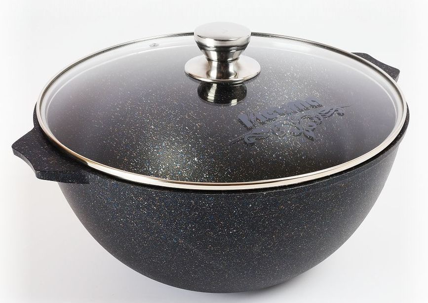 Казан для плова 7л с антипригарным покрытием и стеклянной крышкой серии "Гранит star" Подходит для всех типов плит, кроме индукционных. Можно использовать в посудомоечной машине.