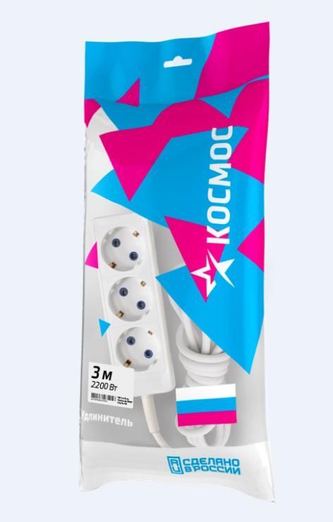 Удлинитель КОСМОС 10А 3 гн ПВС 3*0,75 (3м) с заземл до 1300Вт , Россия