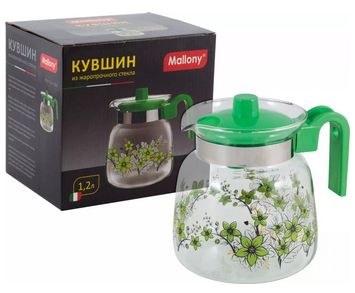 Кувшин Корпус из жаропрочного стекла крышка/ ручка из пластика Объем — 1200 мл Толщина стекла — 1,3 мм 4~11.5?10-6 — коэффициент линейного расширения Упаковка — пузырчатая пленка/цветная коробка Не рекомендуется мыть в посудомоечной машине.