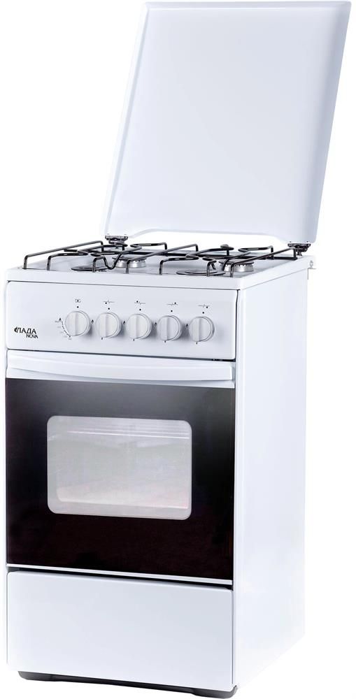 Габаритные размеры, см 50 х 60 х 85 * Цвет белый * Объем духовки 50л * Газ-контроль горелок духовки, Двойное стекло дверцы духовки * 4-х горелочная, металлическая крышка, проволочная решетка стола, хоз. отсек, решетка, жаровня *