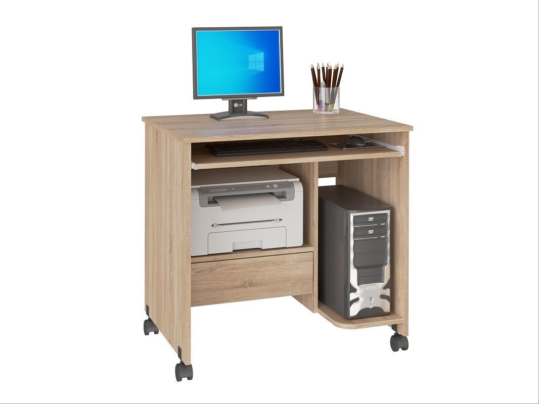 Стол компьютерный СК-05 создан для комфортной работы за компьютером дома и в офисе. Благодаря своим компактным размерам и современному дизайну стол отлично впишется в любой интерьер. Стол оснащен выдвижной полкой для клавиатуры и открытой секцией под системный блок. В выдвижном ящике удобно хранить канцелярские принадлежности и документы, а полка над ним прекрасно подойдет для установки оргтехники. Наличие опор-колес делает эту модель очень мобильной: Вы без труда можете менять расположение стола внутри помещения. Размеры: Ш*В*Г (800*780*600) мм. Материал каркаса: ЛДСП Дуб сонома. Материал фасада: ЛДСП Дуб сонома. Направляющие ящика и выдвижной полки: роликовые. Срок службы (мес.) 120 Гарантия (мес.) 24. Стол можно дополнить шкафом для документов исп.1 из коллекции Найс.
