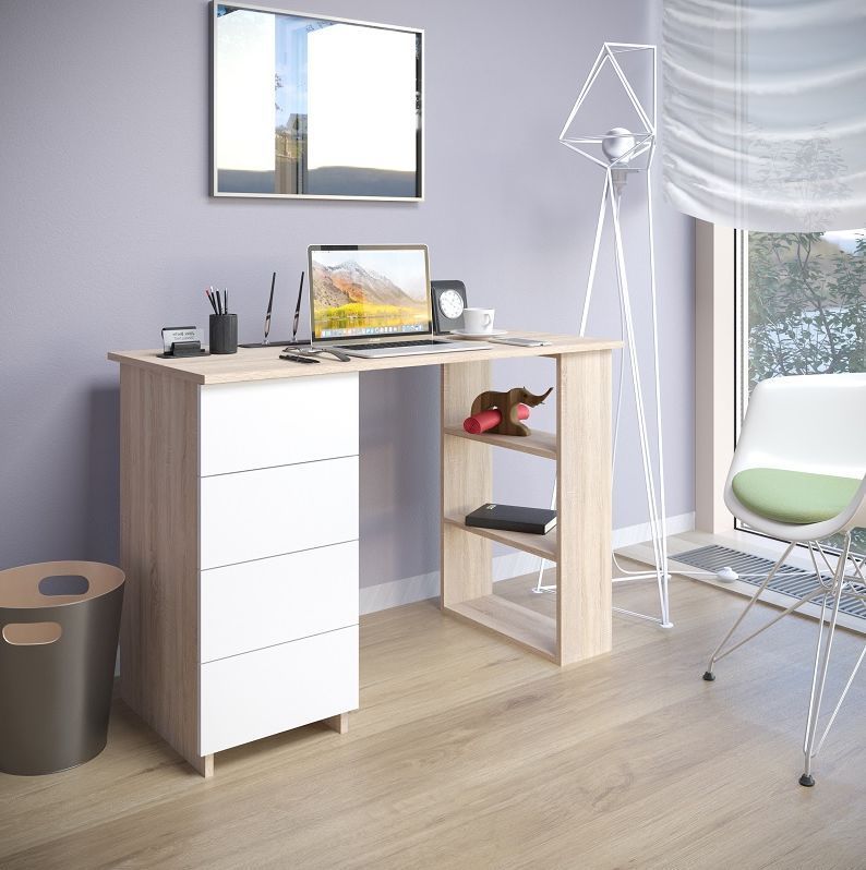 Стол письменный СП-05 создан для комфортной учебы и работы за компьютером. Благодаря своим компактным размерам и современному дизайну стол отлично впишется в интерьер любого дома или офиса. Стол оснащен четырьмя выдвижными ящиками, в которых удобно хранить канцелярские принадлежности и документы. Открытый стеллаж под столешницей прекрасно подойдет для книг и органайзеров. Возможна сборка на правую и левую сторону. Размеры: Ш*В*Г (1100*750*500) мм. Материал каркаса: ЛДСП Дуб сонома Материал фасада: ЛДСП Белый Направляющие ящиков: роликовые Срок службы (мес.) 120. Гарантия (мес.) 24. Стол можно дополнить шкафом для документов исп.1 из коллекции Найс.