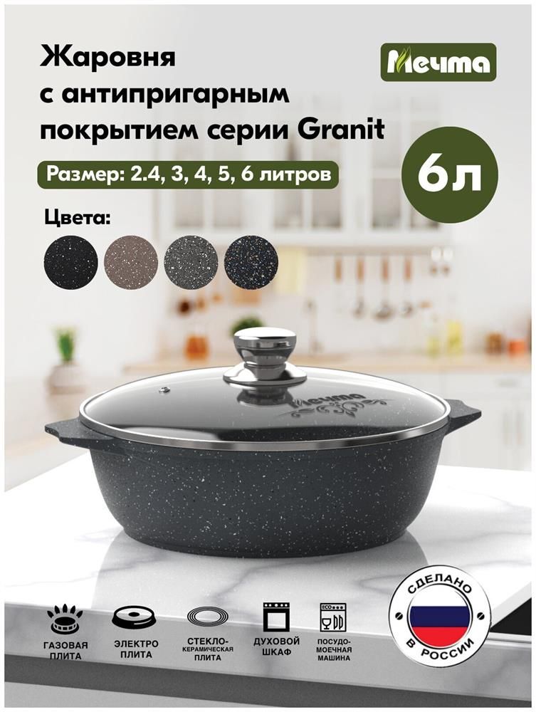 Жаровня 6л (32 см) с антипригарным покрытием и стеклянной крышкой серии "Гранит" Подходит для всех типов плит, кроме индукционных. Можно использовать в посудомоечной машине. Можно использовать в духовке отдельно без крышки.