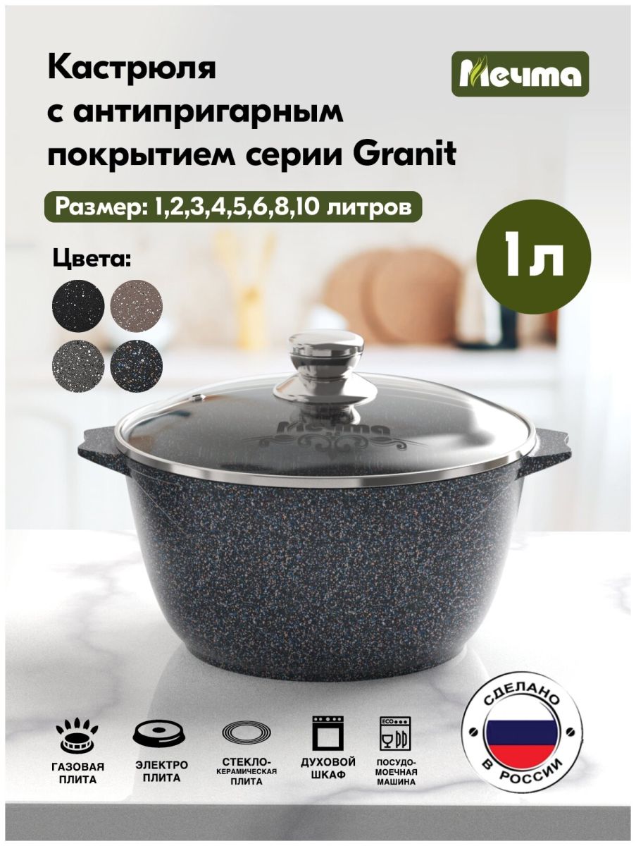 Кастрюля 1л. со стеклянной крышкой. Антипригарное покрытие Greblon на водной основе без PFOA. Серия "Гранит". Подходит для всех типов плит, кроме индукционных. Можно использовать в посудомоечной машине. Ресурс более 12 000 циклов, толщина покрытия до 55 мкр. Толщина дна 5,5-6мм., толщина стенок 3,6-4мм. Покрытие Greblon позволяет готовить с минимальным количеством масла, сохраняя вкусовые и полезные свойства продуктов. Литой толстостенный корпус не подвержен деформации, а утолщенное дно равномерно распределяет тепло по всей поверхности.