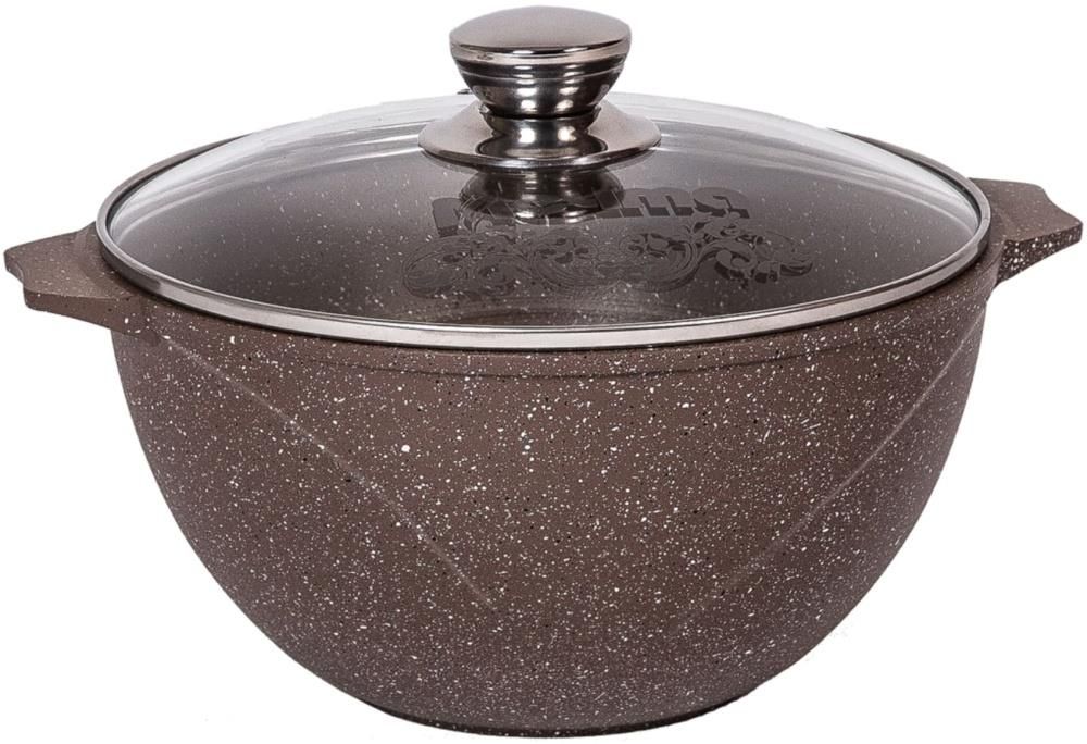 Казан для плова 6л. со стеклянной крышкой. Антипригарное покрытие Greblon Rough на водной основе без PFOA. Серия "Гранит brown". Подходит для всех типов плит, кроме индукционных. Можно использовать в посудомоечной машине. Ресурс более 15 000 циклов, толщина покрытия до 55 мкр. Толщина дна 5,5-6мм., толщина стенок 3,6-4мм. Покрытие Greblon Rough позволяет готовить с минимальным количеством масла, сохраняя вкусовые и полезные свойства продуктов. Литой толстостенный корпус не подвержен деформации, а утолщенное дно равномерно распределяет тепло по всей поверхности.