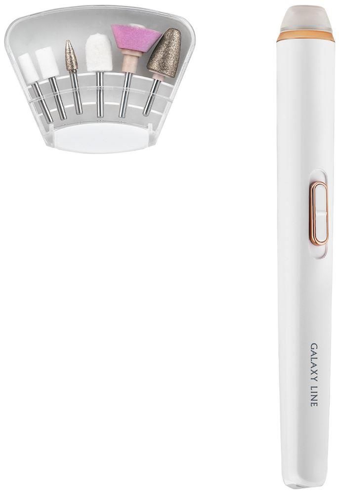 GALAXY LINE GL 4913 Набор для маникюра и педикюра, до 2,5 ч непрерывной работы, 2 скорости, 2 направления вращения, подсветка, USB - зарядка, Li-ion аккумулятор емкостью 350 мА•ч, 6 насадок в комплекте: фреза дисковая для шлифовки, фреза большая конусообразная, фреза малая конусообразная, фреза цилиндрическая для шлифовки, фреза конусообразная для шлифовки, фреза аркообразная для полировки; кейс для хранения насадок, упакован в цветную коробку , 0,5 Вт, напряжение аккумулятора 3,7 В, максимальный входной ток 1А, входное постоянное напряжение 5 В,