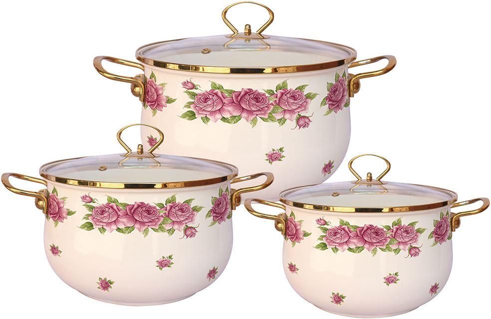 Набор кастрюль ZEIDAN Z-80629 6 предметов Roses, Набор кастрюль, 6 предм. (3 КАСТРЮЛИ С КРЫШКАМИ: 2.4 Л (d18 см), 3,2 Л (d20 см), 5,7 Л (d24 см) с внутренним и внешним трехслойным эмалированным покрытием, материал - углеродистая сталь. Ручки на корпусе и крышке "под золото". Подходит для индукции. Подарочная упаковка.