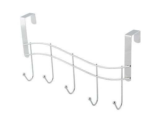 Вешалка навесная с 5ю крючками Крепится на дверь (без сверления, клея и пр.) размер: 38*22*10,5 см длина внутреннего крючка: 4.5CM (толщина полотна не более 4,5 см) Максимальная нагрузка 5 кг материал: хром.металл Вес 210 гр