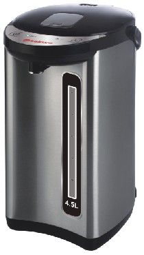 Мощность: 750 Вт. Объем: 4,5л. Чайник-термос с функцией кипячения и поддержания температуры на уровне 85-90°С. Двойная защита от перегрева и включения без воды. Два способа подачи воды: автоматический кнопкой, нажатием чашки. Поворот основания на 360°. Световые индикаторы режима работы. Материал колбы: нержавеющая сталь. Материал корпуса: металл. Цвет черный/нерж. сталь.