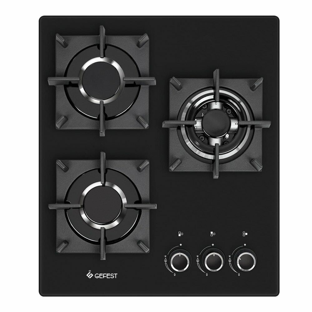 Габаритные размеры ШхГхВ: 45х52.5х10 см. Цвет: черный. Варочная поверхность: стеклянная, "Газ-контроль" горелок стола. Три горелки: одна горелка - двухзонная, две горелки - средней мощности. Встроенный электророзжиг в ручки, фиксированное положение "малое пламя". Чугунные решетки.