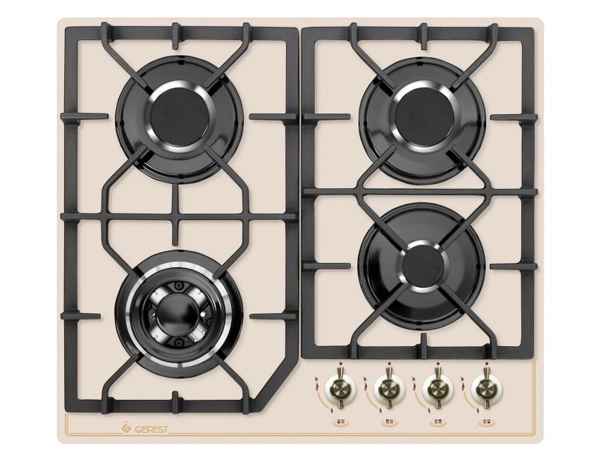 Габариты ШхГхВ: 60х52.5х10 см; Цвет: кремовый с рисунком "ретро"; Варочная поверхность: стеклянная; Газ-контроль горелок стола; Чугунные решетки горелок стола; Двухзонная горелка; Электророзжиг горелок, встроенный в ручки; Фиксированное положение «малое пламя»