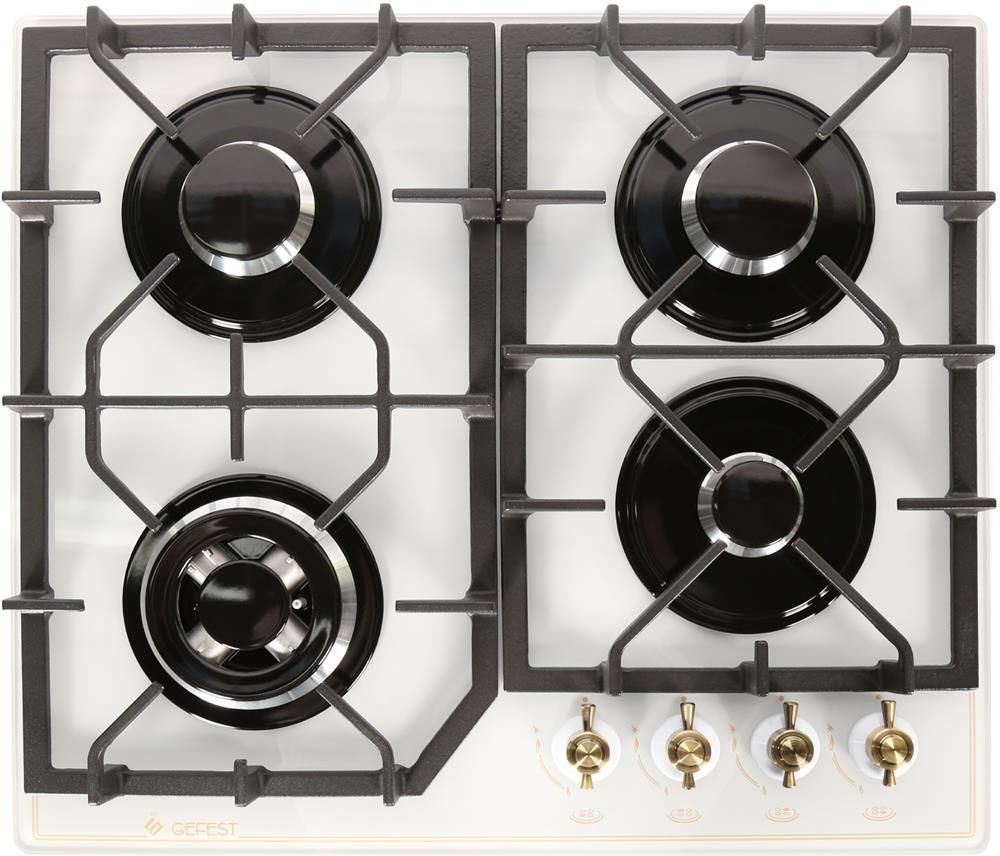 Размеры монтажного проема, ШхГ, см 55,4 х 48,6 * Ширина, см 60, Глубина, см 52,5. Высота, см 10 * Тип подключения Газовый * Количество зон приготовления 4 * Цвет модели Белый * Дизайн Ретро * Материал варочной поверхности Стекло * Материал решеток варочной поверхности Чугун * Газ-контроль горелок стола. Электророзжиг горелок стола Розжиг встроен в ручки * Двухзонная горелка варочной поверхности *