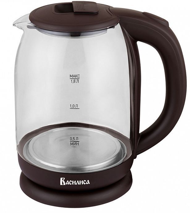 Объем 1,8 л. Номинальная потребляемая мощность 1500 Вт. Корпус из высококачественного термостойкого стекла. Закрытый нагревательный элемент из нержавеющей стали. Вращение корпуса на 360°. Цвет: коричневый. Шкала уровня воды. Внутренняя LED-подсветка. Отсек для хранения электрошнура. Автоматическое отключение при закипании. Блокировка включения без воды.