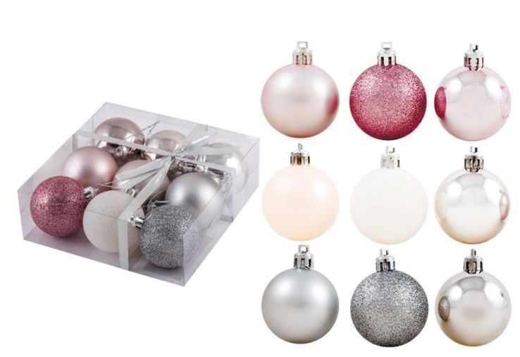 Набор шаров "Жемчуг". размер: 6 см. кол-во 9 шт (мат, глянец, блеск). цвет как на фото. материал: пластмасса, полиэстер. упаковка: ПВХ-коробка.