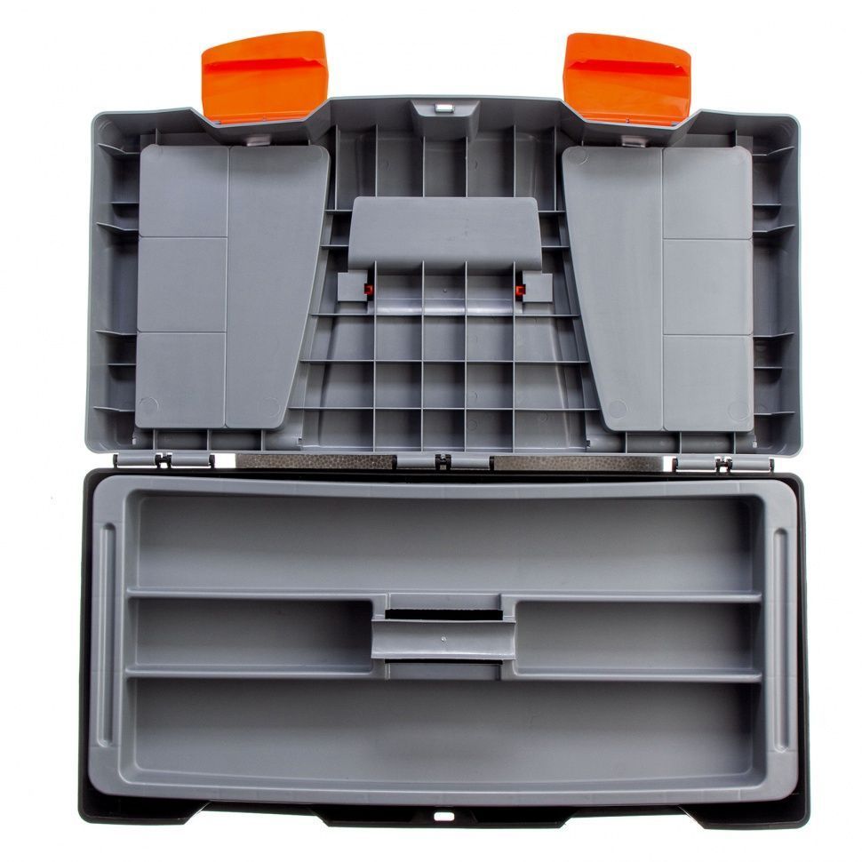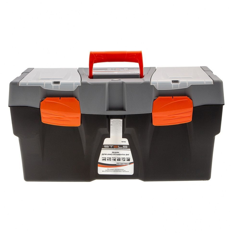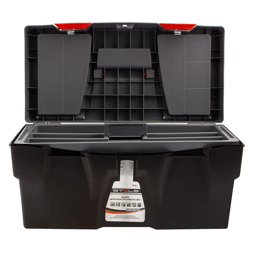 STELS Ящик для инструмента 23" 590х300х300 мм, пластик 90706 Инструментальный ящик с дополнительными секциями. Ящик размером 59 х 30 х 30 см (24") изготовлен из полипропилена, имеет два встроенных органайзера с крышкой и съемный 3-х секционный лоток. Предназначен для хранения и транспортировки инструмента, расходных материалов и крепежных изделий, а также любых сходных по габаритам бытовых товаров. Материал полипропилен Особенности наличие лотка Габариты 590 x 300 x 300 мм